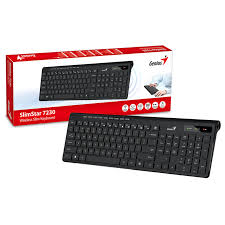 Teclado Genius 7230 con teclas de perfil bajo y escritura silenciosa. Ideal para jornadas prolongadas de tipeo en oficina o en casa.
